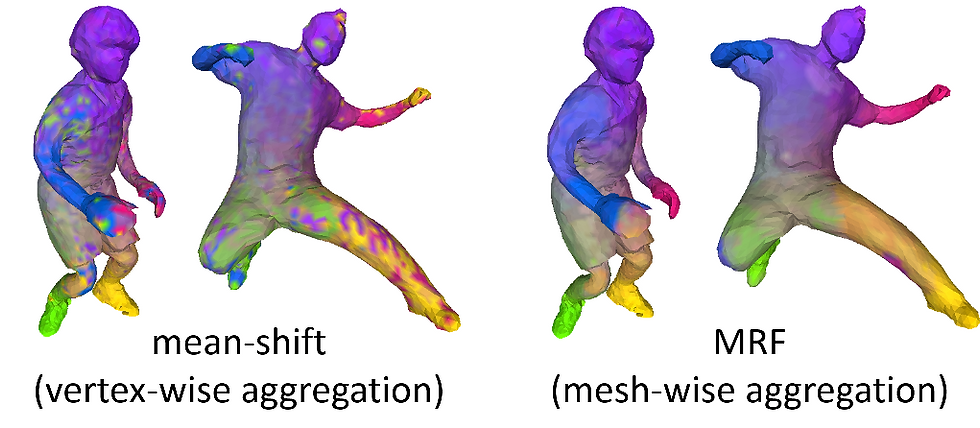The inferred data-model associations from the forests often look noisy (left image) because it does not respect the triangles/edge connectivity. In this project, we mitigate this by proposing a new way to aggregate leaf-node predictions from each tree. As the correspondences are highly interdependent among the local neighborhood, we apply random fields (MRF/CRF) to regularize them, yield the optimal configuration w.r.t. the whole shape (right image). The aggregation is therefore mesh-based rather than vertex-based.